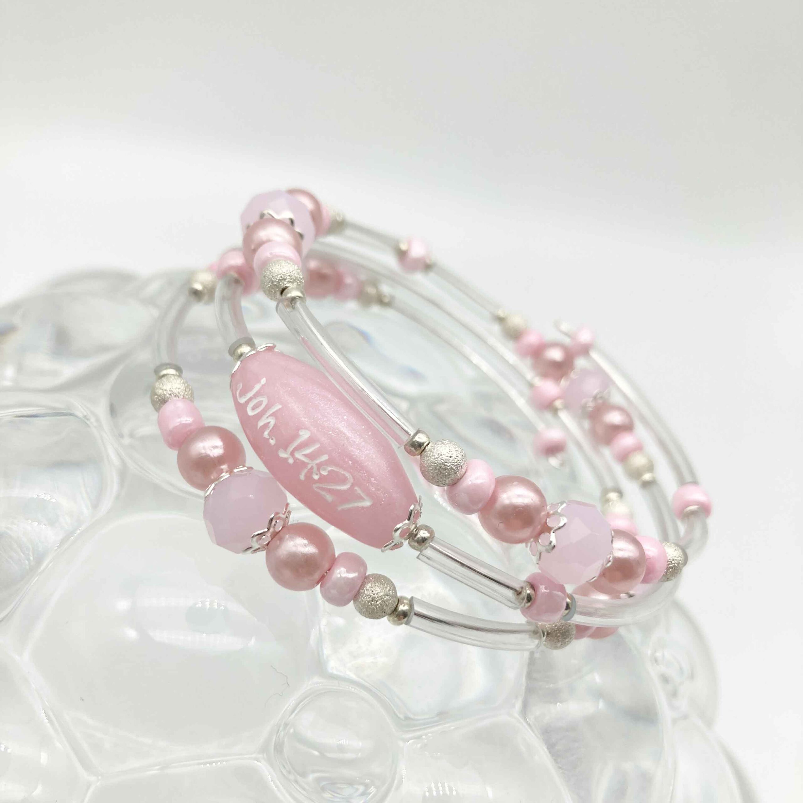 Wirearmband med handgjord pärla av polymerlera med inpräglad text Joh 14:27. ”Frid lämnar jag efter mig åt er, min frid ger jag er. Inte ger jag er en sådan frid som världen ger. Låt inte era hjärtan oroas och var inte modlösa”