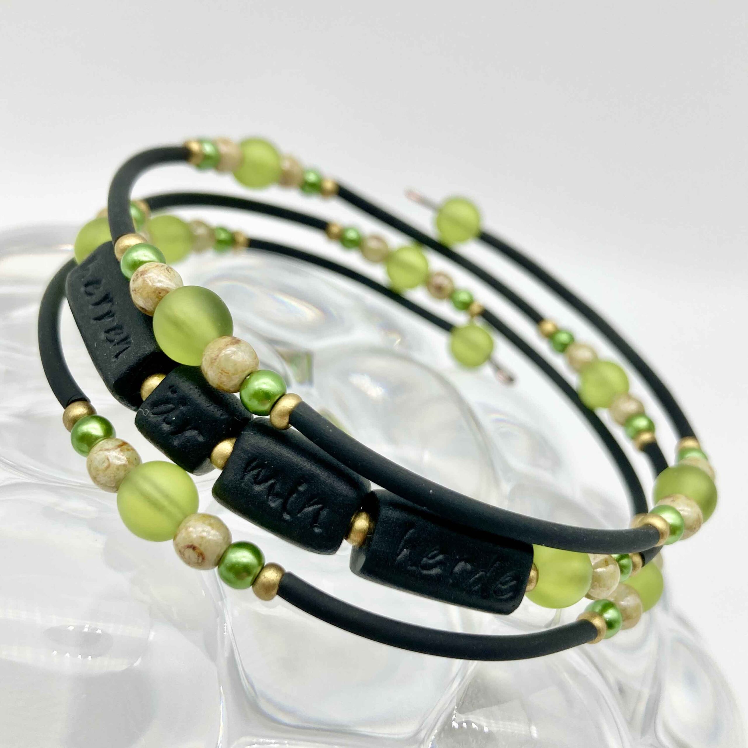 Wirearmband med handgjord pärla av polymerlera med inpräglad text ”Herren är min herde”
