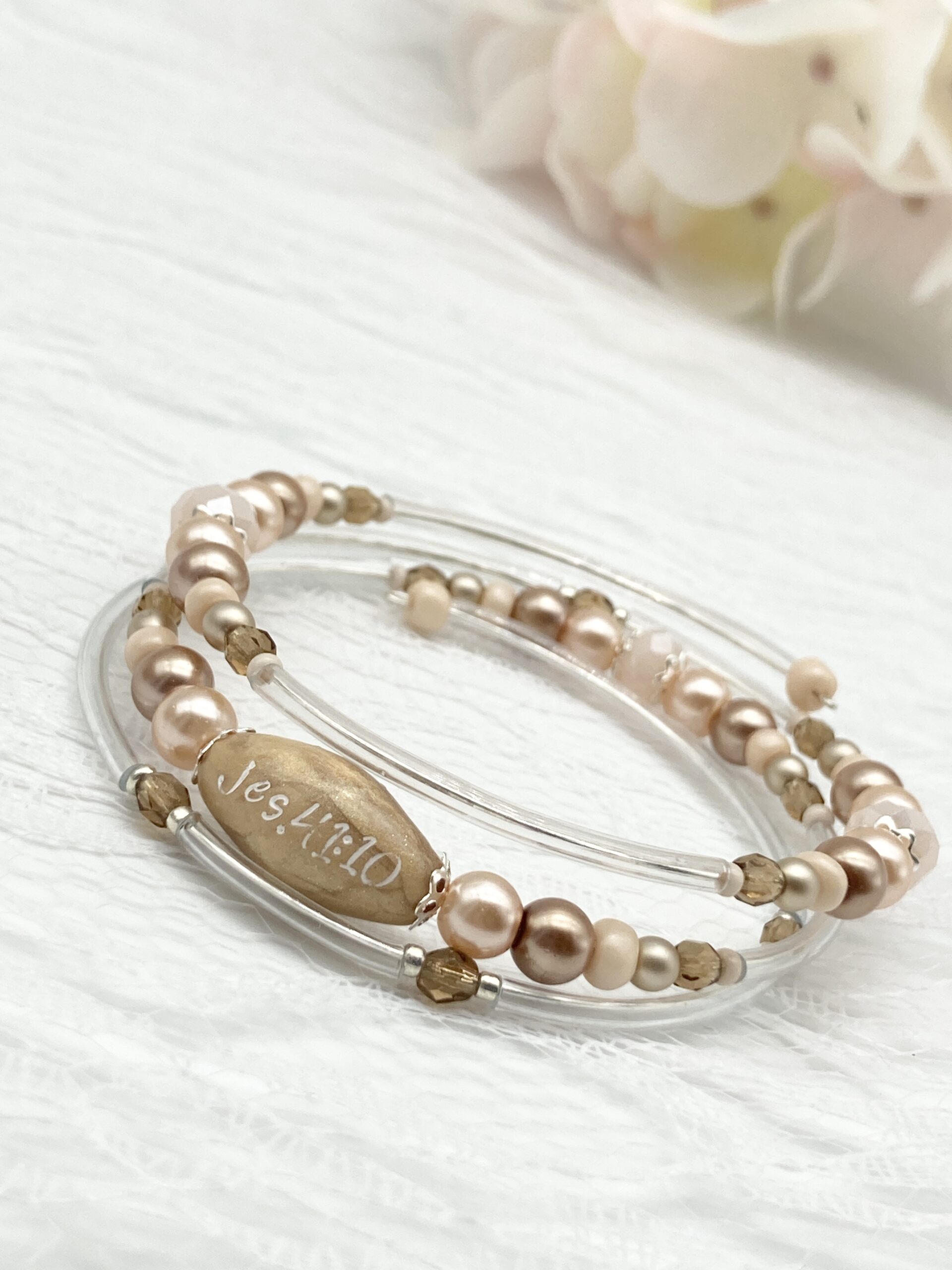 Wirearmband med handgjord pärla av polymerlera med inpräglad text Jes 41:10